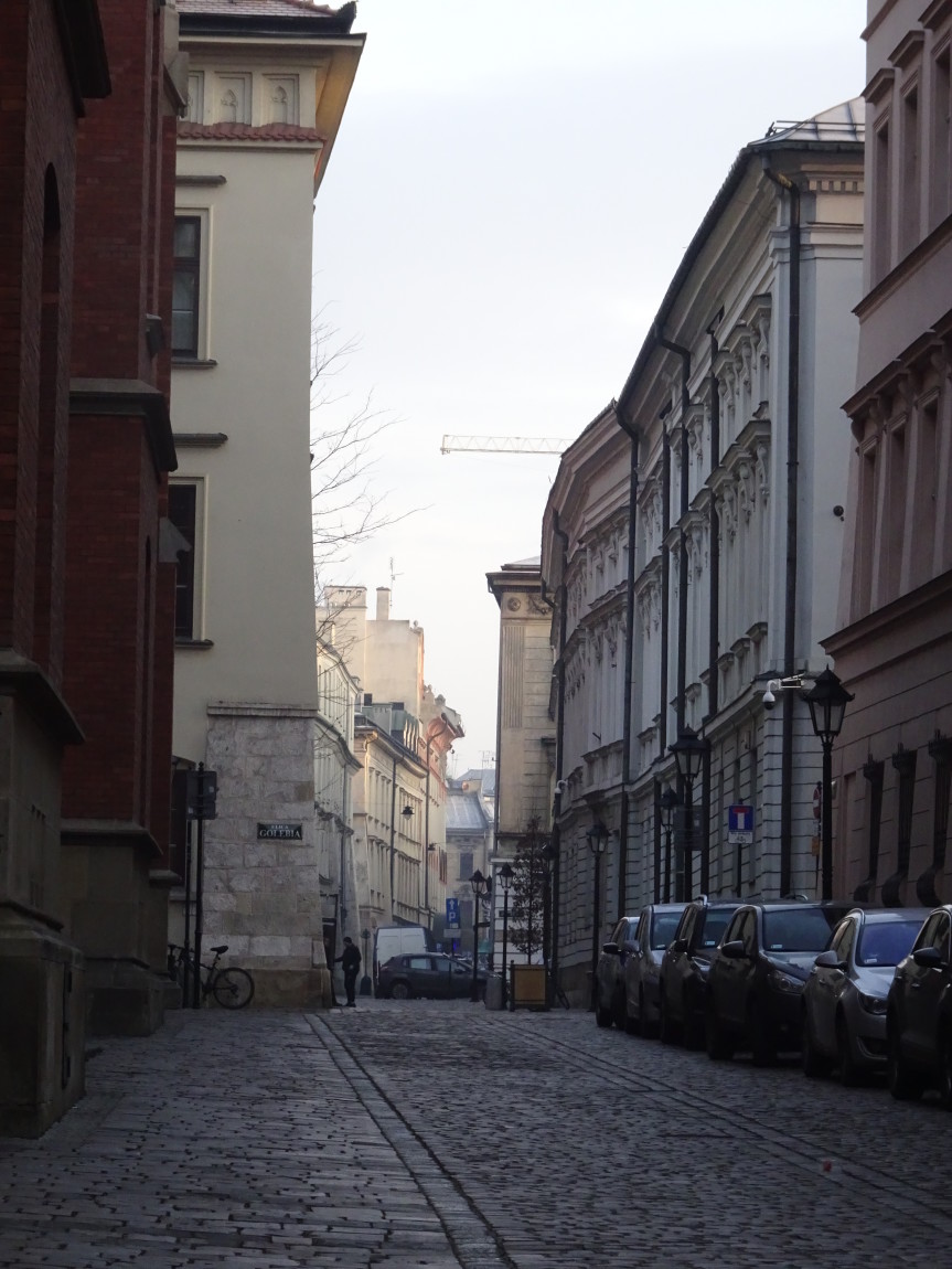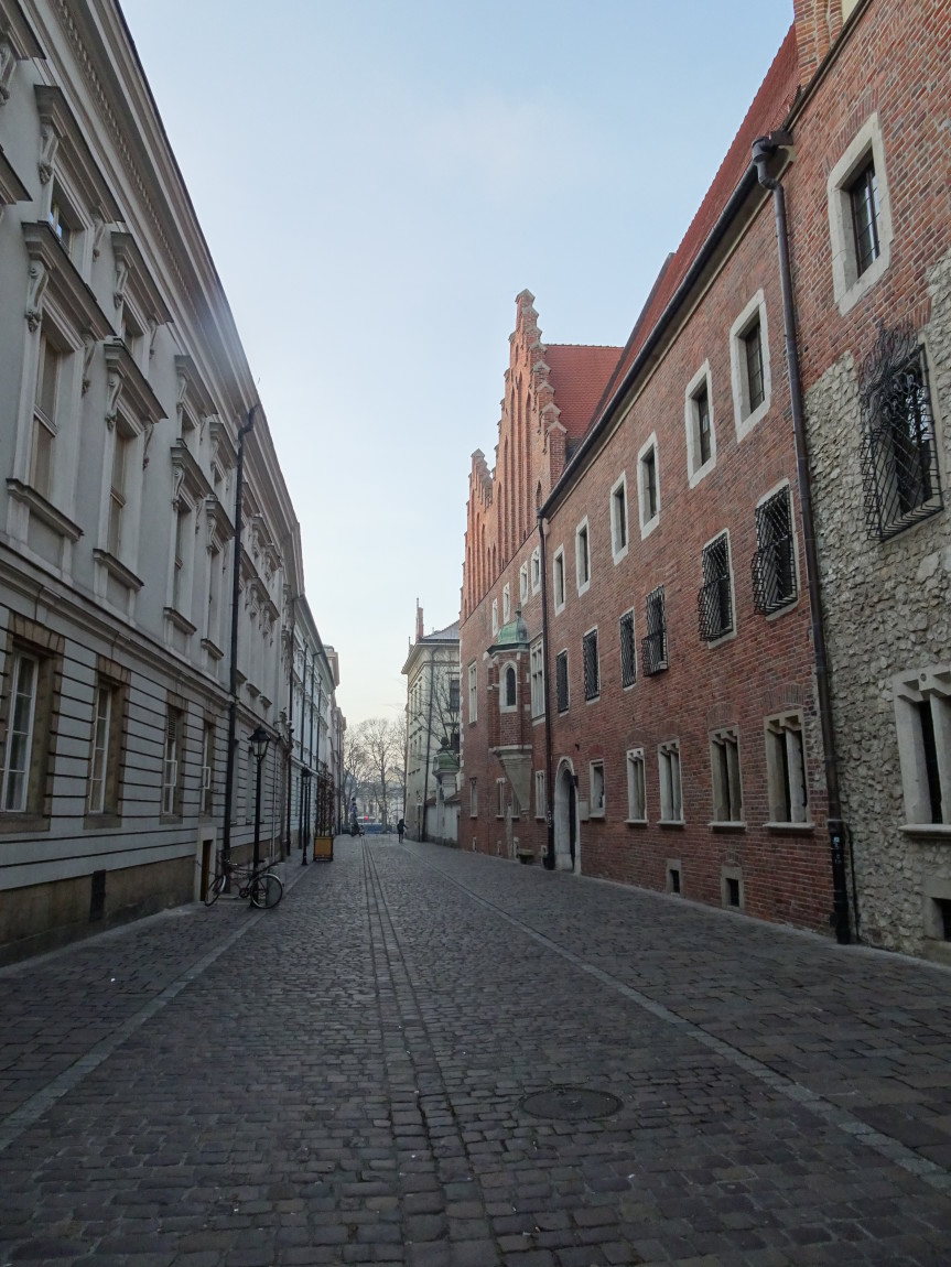 Dość pójść i sprawdzić : „uniwersytecki” czyli zachodni ogonek ulicy wyraźnie skręca ku południowi. Może się to wiązać z faktem, że ta część miasta lokacyjnego opierała się o koryto i rozlewiska Wisły, a co najmniej fragment dzielnicy żydowskiej (późniejszego kwartału uniwersyteckiego) najzwyczajniej w świecie ulokowany został na gruntach … nadsypanych. I to jeszcze przed powstaniem fortyfikacji czyli miejskich murów.