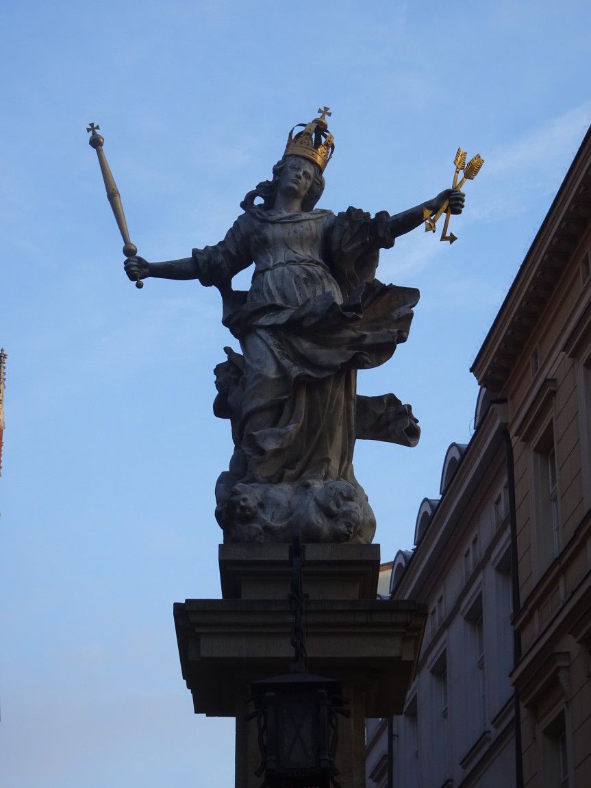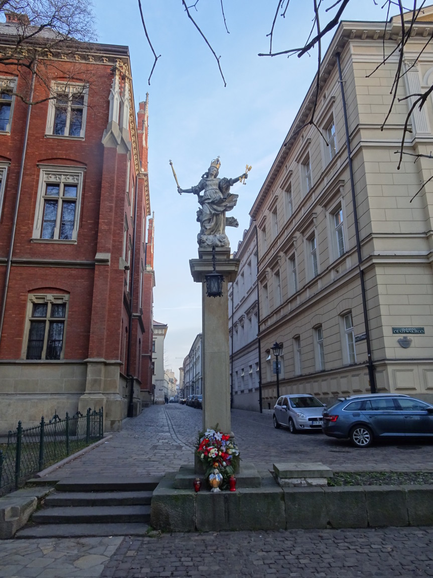 Po pierwsze – Drodzy PT Autorzy mądrych opisów, którzy przepisujecie jedni od drugich – ul. Jagiellońska nie jest i nigdy nie była prosta...W swojej wędrówce przez Kraków Matka Boska z berłem i w koronie dotarła na ul. Jagiellońską. Jest repliką dawnej figury, która najpierw zdobiła bramę do cmentarza mariackiego, skąd po zniesieniu cmentarza trafiła do wylotu ul. Kapucyńskiej na Planty – a stamtąd na dzisiejsze miejsce.