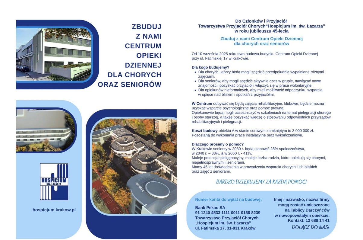 Starzejemy się. W 2030 roku seniorzy stanowić będą 28% społeczeństwa. Stąd w 45. roku działalności Hospicjum św. łazarza w Krakowie podjęło decyzje o rozbudowie domu i stworzeniu w nim Centrum Opieki Dziennej dla chorych i seniorów, a także opiekunów nieformalnych. Po to, by mogli wspólnie spędzić czas, uczestniczyć w rehabilitacji, uzyskać pomoc psychologiczna i prawną, móc uczestniczyć w szkoleniu.