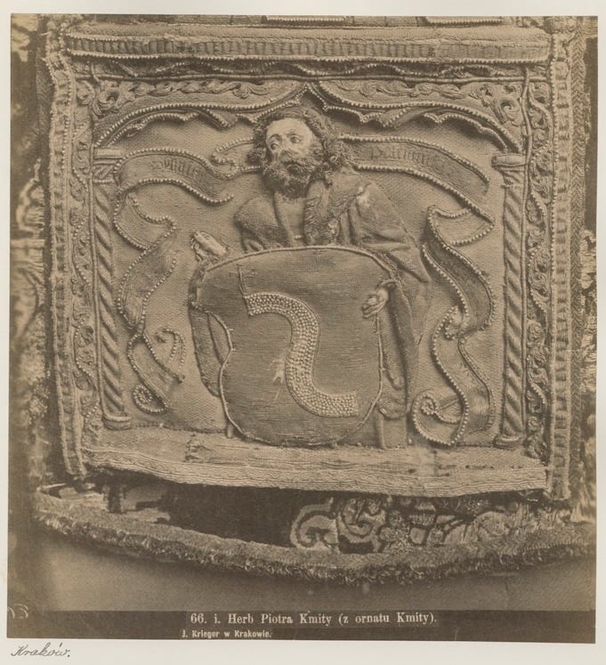 Fragment ornatu Piotra Kmity: Tarczan trzymający herb Śreniawa, fot. Zakład fotograficzny "Ignacy Krieger", 4 ćw. XIX w., Archiwum Nauki PAN i PAU w Krakowie