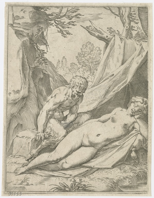 Agostino Carracci, Satyr przy śpiącej nimifie (z serii "Lascivie"), Rzym ok.1585-1600, miedzioryt, Gabinet Rycin, Biblioteka Naukowa PAU i PAN w Krakowie, BGR.035353