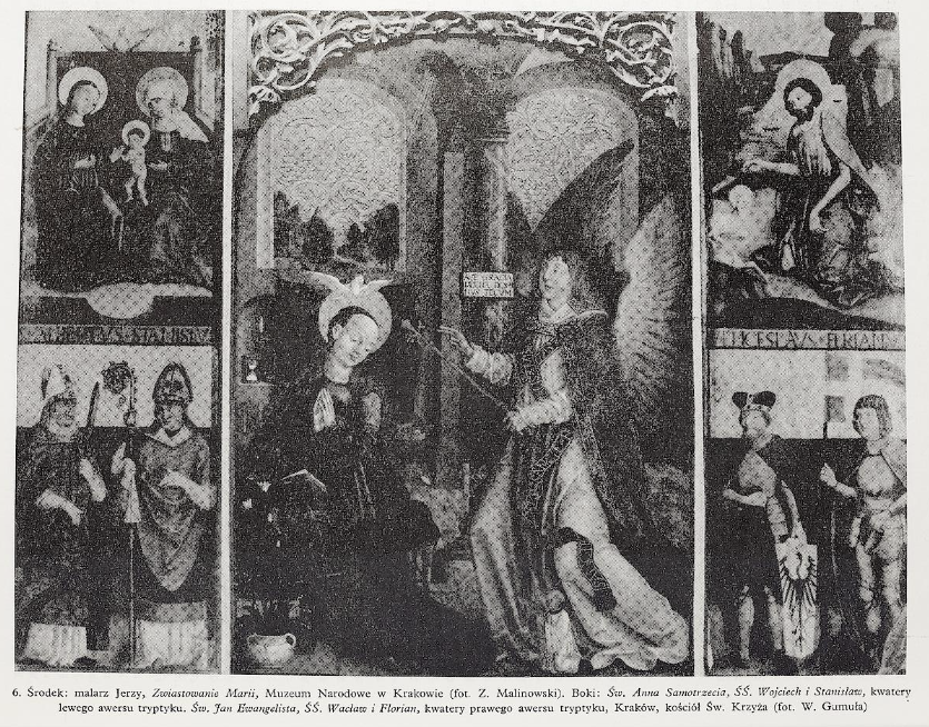 Fot. wg Kazimierz Kuczman, Katarzyna Stangrett, "Skrzydła oltarza w krakowskim kościele Św. Krzyża o obraz "Zwiastowanie" malarza Jerzego w Museum Narodowym w Krakowie", Folia Historiae Artium 10 (1974), s. 107-116, il. 6 (https://digi.ub.uni-heidelberg.de/diglit/fha1974/0115/image)