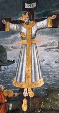 Drzeworyt ilustrujący legendę o skrzypku i krucyfiksie Volto Santo, Lubeka 1492