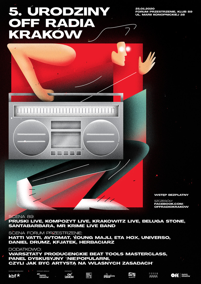 Uczestnicy urodzin będą mogli jednocześnie bawić się na scenie zlokalizowanej w Forum Przestrzenie. Pod kultowym neonem “KRK” wystąpią DJ’e i DJ’ki, prezentujący taneczną muzykę klubową. Nietypowe podziały rytmiczne, przyprawione improwizowanymi na żywo wokalami, zaprezentuje Avtomat - artysta związany z pro-równościowym kolektywem Oramics. Hatti Vatti, wspominany już przy okazji warsztatów, zagra seta DJ’skiego wypełnionego brytyjską elektroniką. UK bassem w swoich miksach inspiruje się również Young Majli, związana na co dzień z wrocławskim kolektywem regime. OFF Radio Kraków będzie reprezentował m.in. Daniel Drumz, znany ze swojej szerokiej działalności artystycznej, w której muzyka elektroniczna zawsze wysunięta jest na pierwszy plan. Szereg autorskich projektów i współprac sprawiły, że Drumz grał swoją muzykę m.in. w Tokio, Nowym Jorku, Chicago, Moskwie czy Londynie. W gronie DJ’skim znajdzie się także Eta Hox, której mocne i szybkie sety zapełniają parkiety krakowskich klubów. Pod pseudonimem Universo kryje się natomiast Łukasz Maszczyński, znany również ze swojego aliasu Kixnare. W swoich setach krąży wokół różnych form muzyki elektronicznej, nawiązując do brzmień etnicznych i perkusyjnych, syntezatorowego soundu lat 80’ i 90’, krautrocka, ambientu i psychodelii. Przepełnione muzyką house i disco mixy zaprezentują Kfjatek i Herbaciarz, DJ’e znani doskonale krakowskiej publiczności. Podczas ich występów nie zabraknie etnicznych inspiracji i prawdopodobnie najbardziej tanecznej selekcji tego wieczoru.