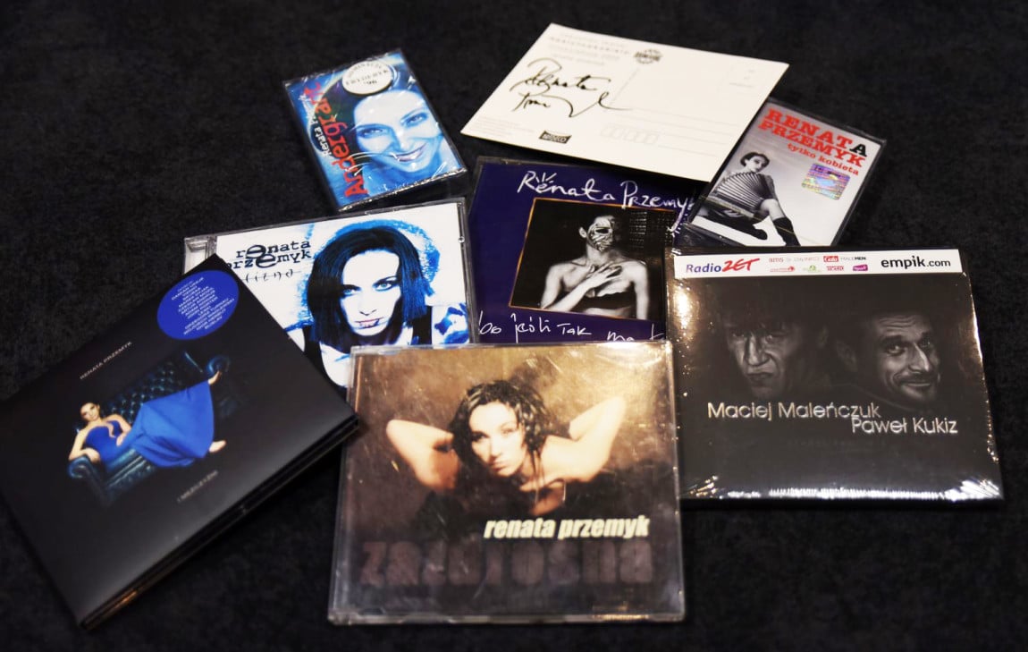 Części z tych wydawnictw nie można już znaleźć w żadnym sklepie. Tym bardziej że niektóre z nich to single radiowe - przeznaczone tylko do promocji w rozgłośniach. Ponieważ w Radiu Kraków zdarliśmy je do spodu, Renata Przemyk wydobyła dla Państwa jeszcze dwa nowiutkie egzemplarze z piosenkami „Bo jeśli tak ma być” i „Zazdrosna”. Płynąc na nostalgicznej fali dorzuciła unikatowe już kasety z wcześniejszymi płytami „Andergrant” i „Tylko kobieta”. Do tego CD „Blizna” i najnowsze dzieło „Renata Przemyk i mężczyźni”. Z DEDYKACJĄ I PODPISEM!!! Natomiast, jeśli o płeć brzydką idzie, mamy absolutną wisienkę na torcie, a mianowicie Kukiza i Maleńczuka śpiewających piosenki z Kabaretu Starszych Panów. Do tego jeszcze unikalne pocztówki z wizerunkiem Pani Renaty. Tyle dobra za jednym zamachem tylko na naszej aukcji!