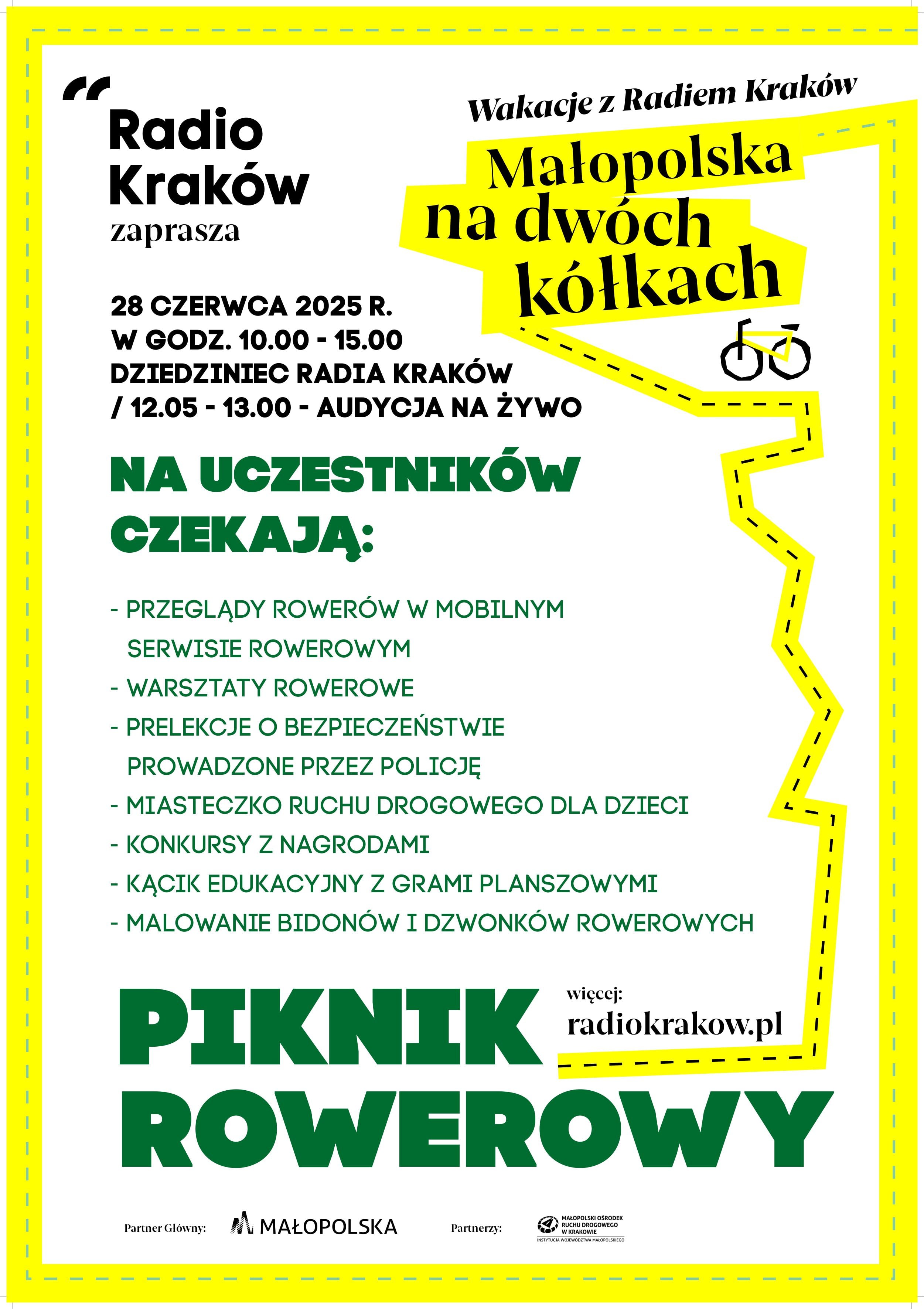 Parking przed budynkiem Radia Kraków zamieni się tego dnia w miasteczko ruchu drogowego. Zapraszamy dzieci i dorosłych do wspólnej zabawy i nauki - najskuteczniejszej, bo w praktyce. Eksperci Małopolskiego Ośrodka Ruchy Drogowego, w przystępnej i atrakcyjnej formie, opowiedzą o zasadach: bezpiecznego poruszania się rowerem po drodze, egzaminów na kartę rowerową i regułach obowiązujących w ruchu drogowym.