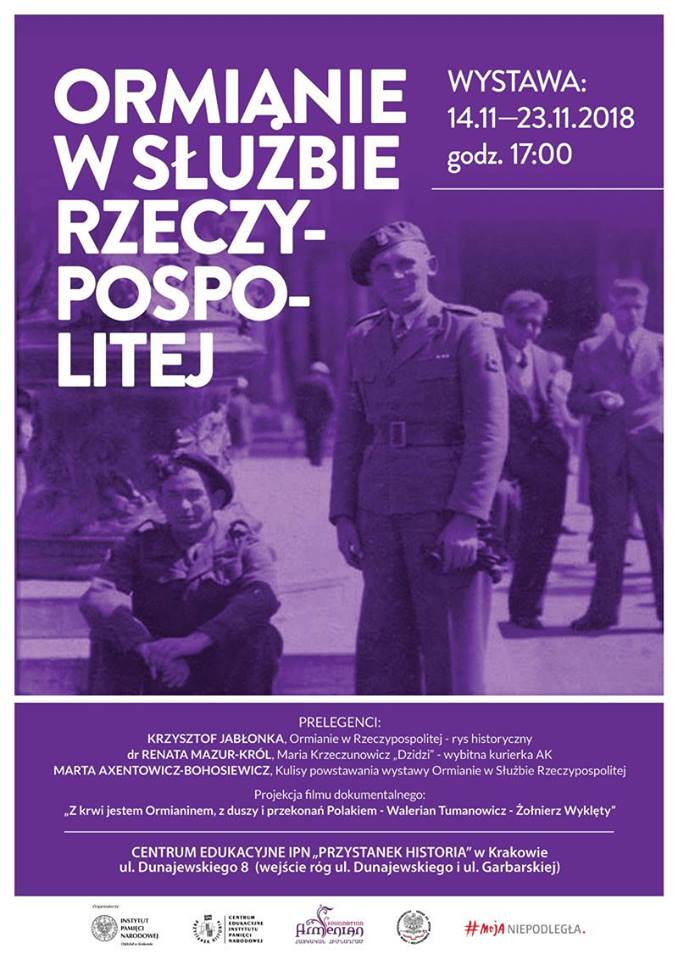 Wystawa, zorganizowana przez Armenian Foundation z okazji 100-lecia niepodległości Polski 650-lecia obecności Ormian w Polsce, prezentuje sylwetki najwybitniejszych przedstawicieli społeczności ormiańskiej działających w obszarach kultury, polityki i wojskowości. Jej otwarciu na "Przystanku Historia" będą towarzyszyć prelekcje oraz pokaz filmu dokumentalnego "Z krwi jestem Ormianinem, z duszy i przekonań Polakiem - Walerian Tumanowicz- Żołnierz Wyklęty". Jako prelegenci wystąpią: Krzysztof Jabłonka z wykładem "Ormianie w Rzeczypospolitej - rys historyczny", dr Renata Mazur-Król z wykładem "Maria Krzeczunowicz "Dzidzi" - wybitna kurierka AK" oraz kurator wystawy Marta Axentowicz-Bohosiewicz z prelekcją "Kulisy powstawania wystawy Ormianie w służbie Rzeczypospolitej".