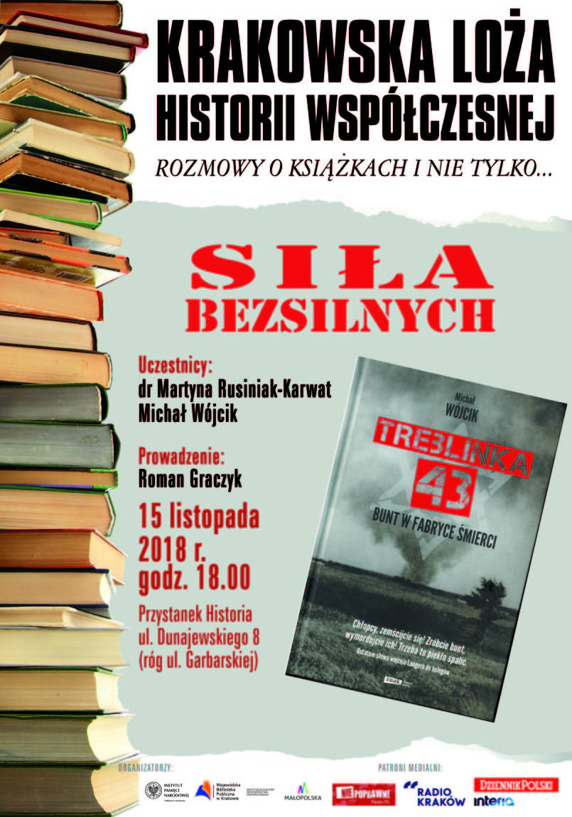 Instytut Pamięci Narodowej Oddział w Krakowie zaprasza na spotkanie Krakowskiej Loży Historii Współczesnej pt. "Siła bezsilnych", które odbędzie się w Centrum Edukacyjnym IPN "Przystanek Historia" w Krakowie przy ul. Dunajewskiego 8 (wejście na rogu z ul. Garbarską) wyjątkowo w czwartek (zamiast we środę) 15 listopada 2018 r. o godz. 18.00. Tym razem dyskusja będzie się toczyć wokół książki Michała Wójcika "Treblinka '43. Bunt w fabryce śmierci" (Wydawnictwo Znak - Litera Nova, Kraków 2018). W spotkaniu, prowadzonym przez Romana Graczyka, prócz autora książki weźmie udział dr Martyna Rusiniak-Karwat.