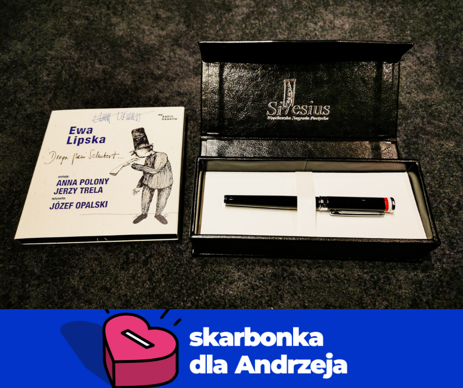 Ewa Lipska przekazała na licytacje pióro wieczne, które otrzymała jako laureatka Wrocławskiej Nagrody Poetyckiej Silesius za całokształt twórczości w 2019 roku. A my dorzucamy premierowe wydawnictwo płytowe z jej autografem jako wyjątkowy dodatek! Tym wspaniałym zestawem możesz obdarować niejednego miłośnika poezji. Zachęcamy do licytowania!