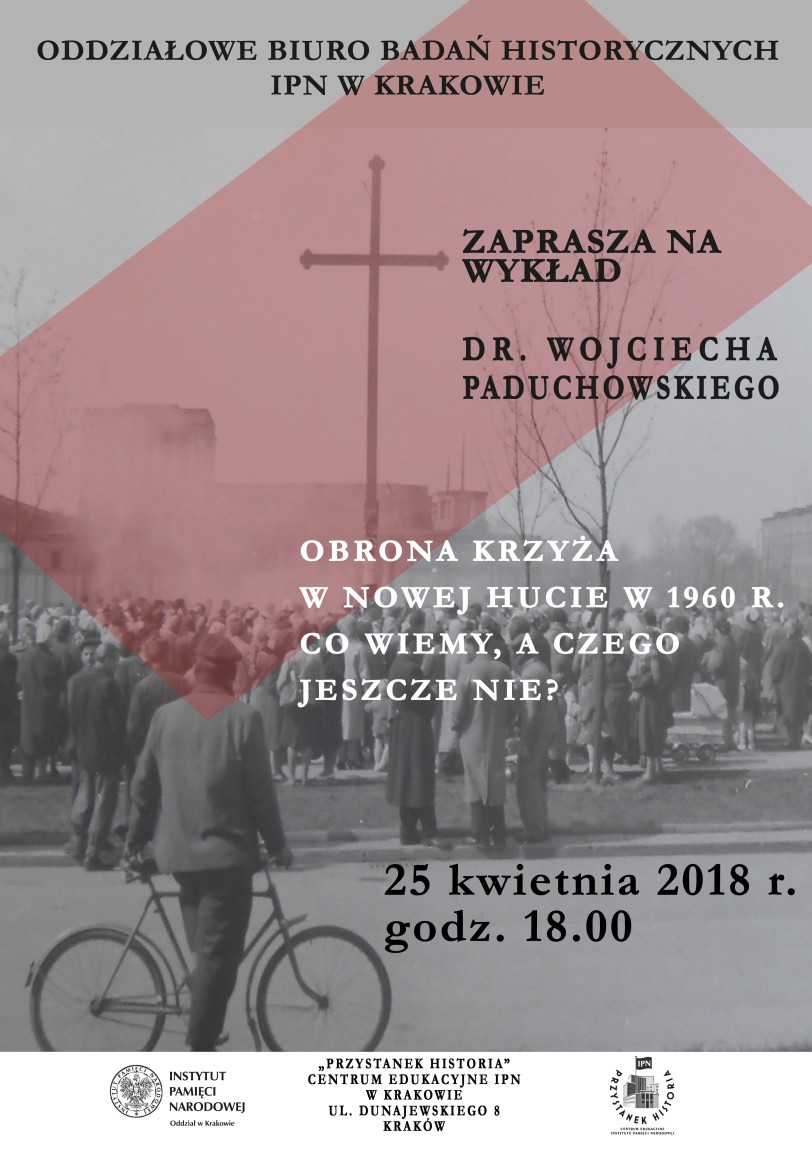 Centrum Edukacyjne IPN "Przystanek Historia" w Krakowie zaprasza 25 kwietnia o godz. 18.00 na wykład dra Wojciecha Paduchowskiego z Oddziałowego Biura Badań Historycznych IPN w Krakowie, zatytułowany „Obrona Krzyża w Nowej Hucie w 1960 r. Co wiemy a czego jeszcze nie?”. Wykład odbędzie się w siedzibie "Przystanku Historia" w Krakowie przy ul. Dunajewskiego 8 (na rogu z ul. Garbarską).