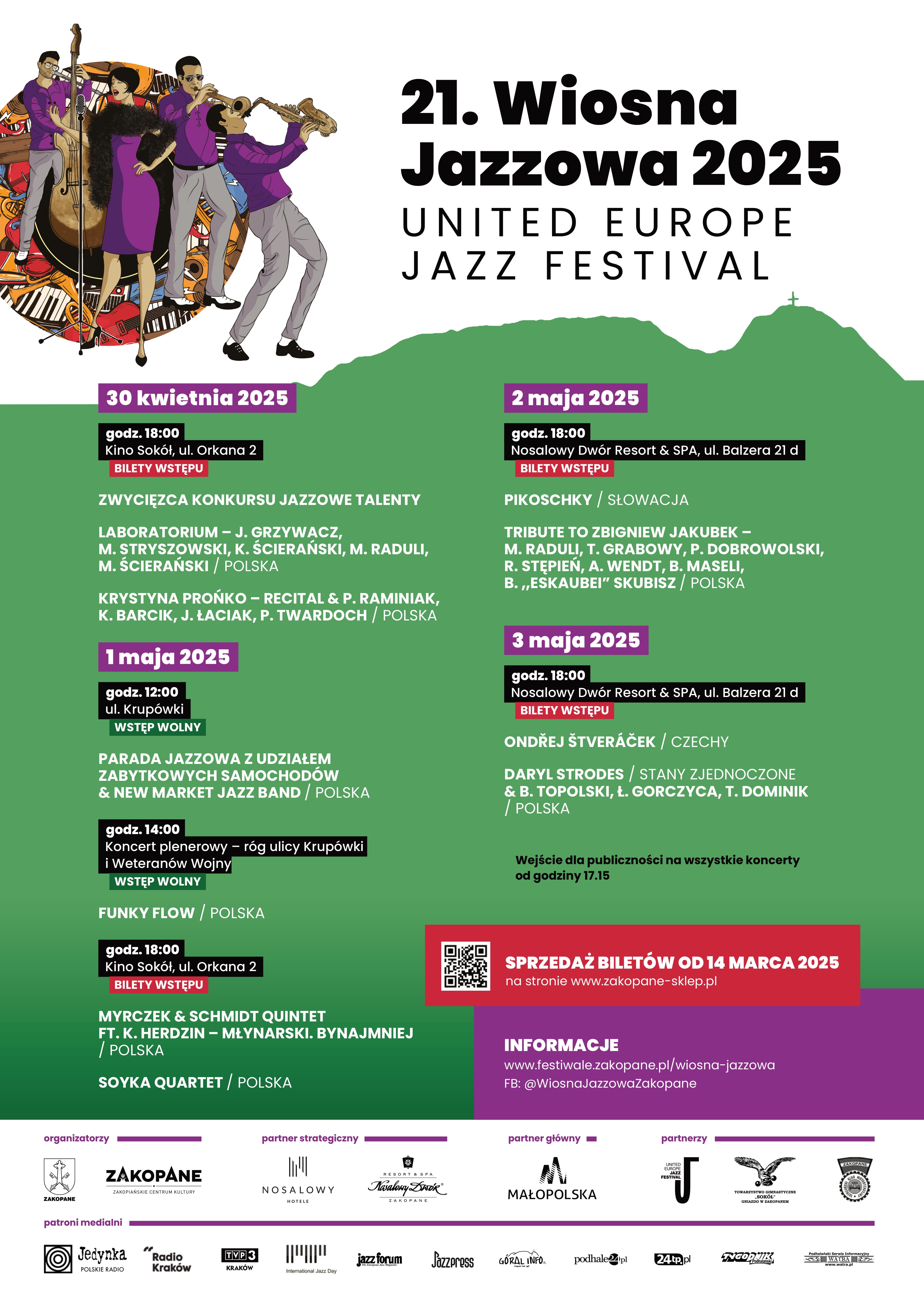 Warto dodać, że partnerem Wiosny Jazzowej – już po raz kolejny – jest Program 1 Polskiego Radia. Popularna Jedynka nadawać będzie wprost ze swojego studia festiwalowego, będą relacje, ale i całe audycje wprost z Zakopanego. Wspaniali goście i wyborna muzyka, przez wszystkie dni festiwalu Jedynka będzie obecna i w mieście i na antenie, a wszystko przekazywać będą muzyczni dziennikarze Programu 1: Paweł Sztompke i Marcin Kusy.