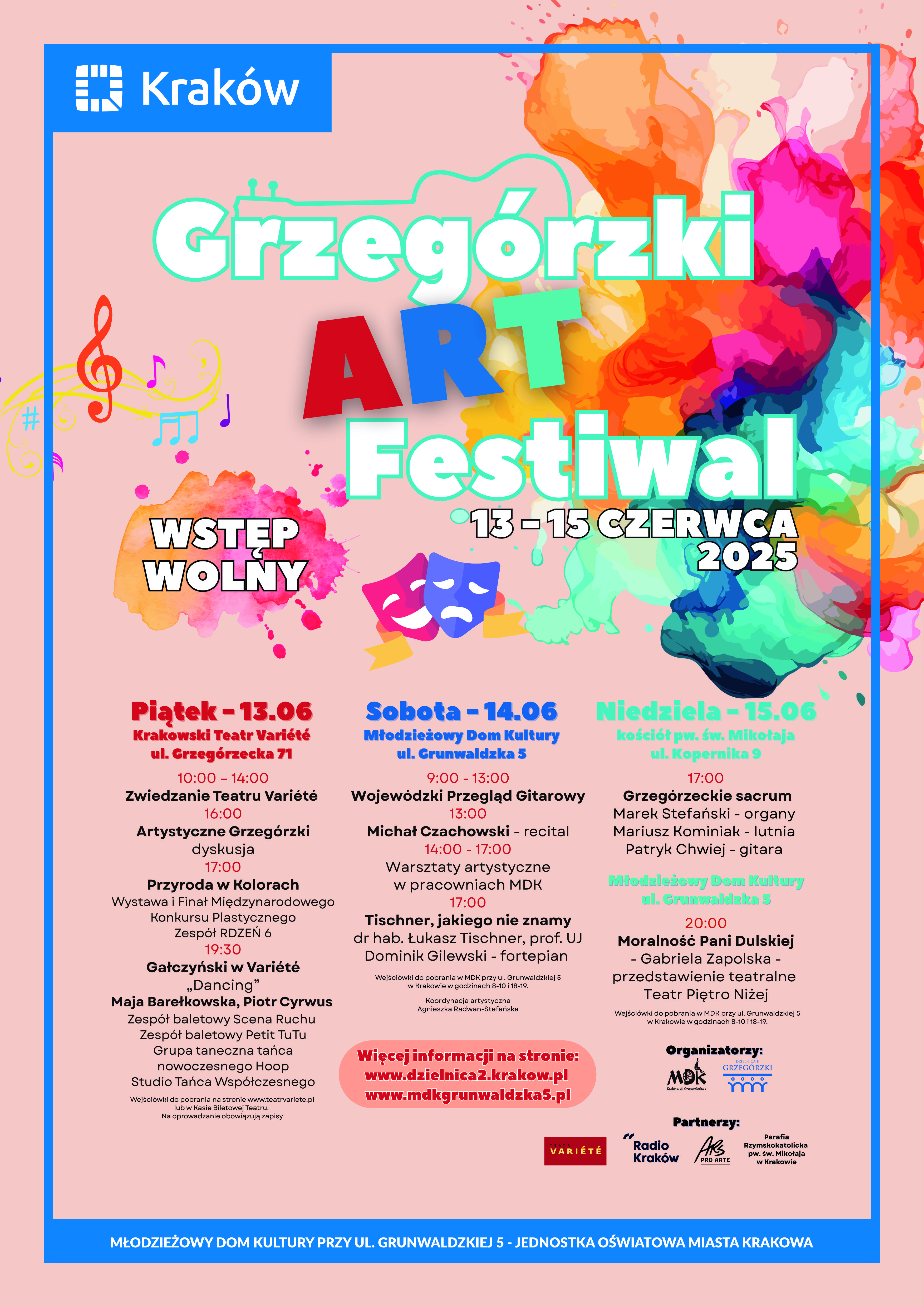 Oficjalne rozpoczęcie festiwalu nastąpi o godzinie 16:00 podczas panelu dyskusyjnego „Kulturalne Grzegórzki”, poświęconego roli kultury w życiu lokalnej społeczności. Chwilę później – o 17:00 – odbędzie się finał Międzynarodowego Konkursu Plastycznego „Przyroda w kolorach”, organizowanego przez Młodzieżowy Dom Kultury przy ul. Grunwaldzkiej 5. To święto dziecięcej i młodzieżowej wyobraźni, które gromadzi uczestników z Polski i zagranicy. Uroczystość uświetni występ zespołu Rdzeń 6, wprowadzając muzyczną energię i radość młodzieżowego święta.