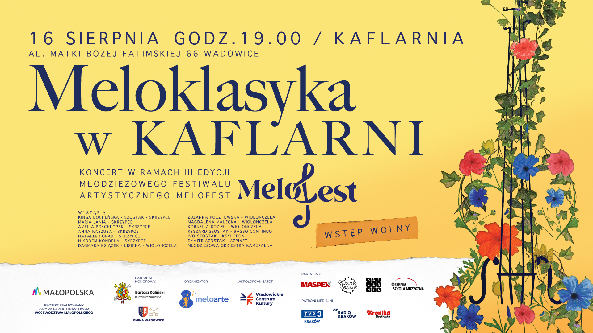Pierwszy - Meloklasyka w Kaflarni - odbędzie się 16 sierpnia o godz. 19.00 w urokliwej Kaflarni znajdującej się w sercu Wadowic przy Al. Matki Bożej Fatimskiej 66. Podczas tego wieczoru zabrzmią skrzypce, wiolonczela, szpinet i ksylofon. Program złożony jest z dzieł wybitnych twórców epoki baroku, takich jak Bach, Vivaldi, Pachelbel czy Marcello. Pełnię XVIII - wiecznego brzmienia dopełni Młodzieżowa Orkiestra Festiwalowa.