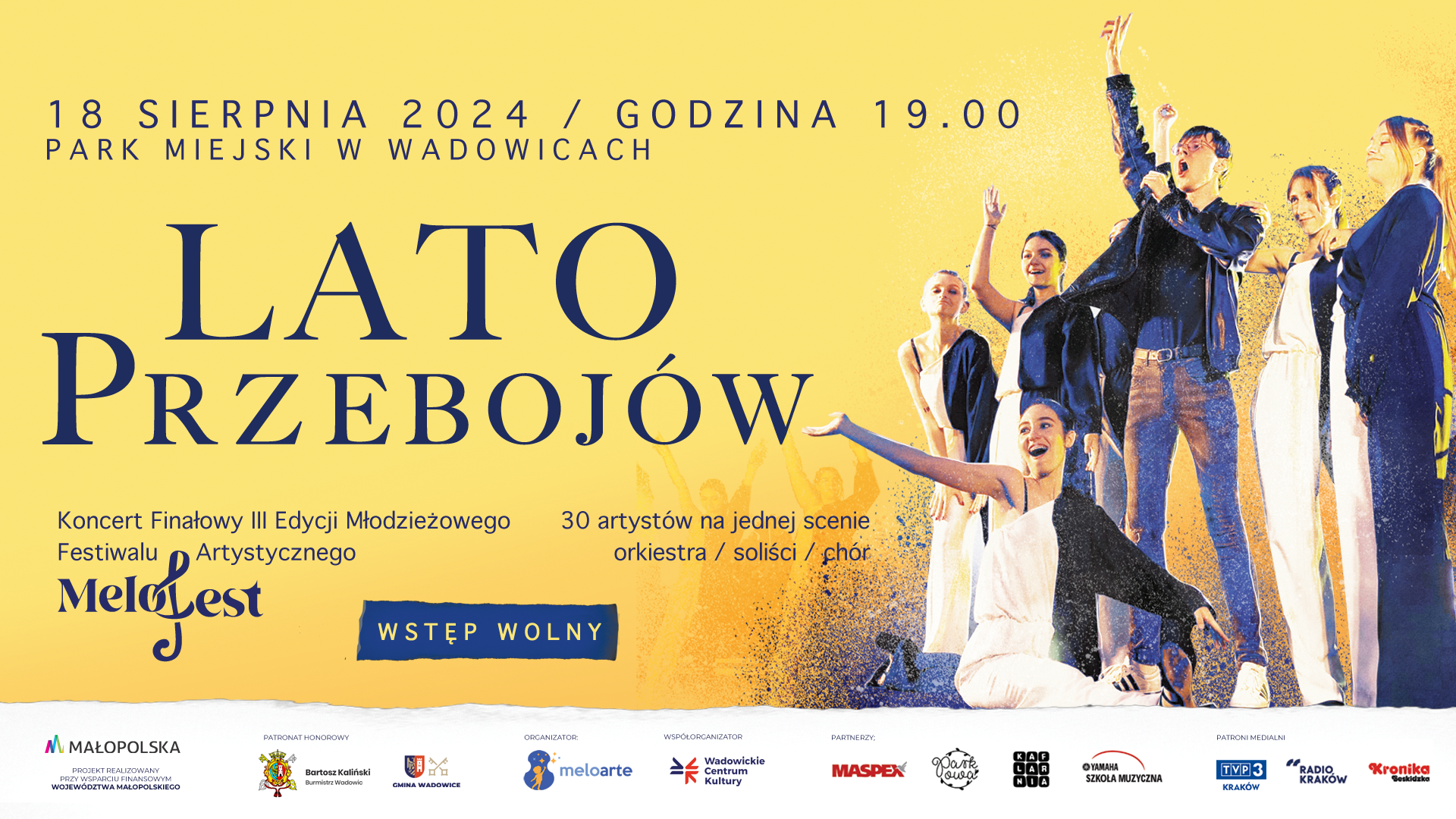 Drugi koncert - Lato Przebojów - odbędzie się 18 sierpnia o godz. 19.00 w Muszli Koncertowej Parku Miejskiego w Wadowicach. To muzyczne show z udziałem wokalistów i Kameralnej Orkiestry Festiwalowej. Program tego koncertu jest niezwykle różnorodny. Zabrzmią miedzy innymi, takie hity jak Footloose, Ain’t No Mountain High Enough, Hit The Road Jack, I’m So Excited. Nie zabraknie również lirycznych tematów muzyki filmowej oraz innych muzycznych niespodzianek.
