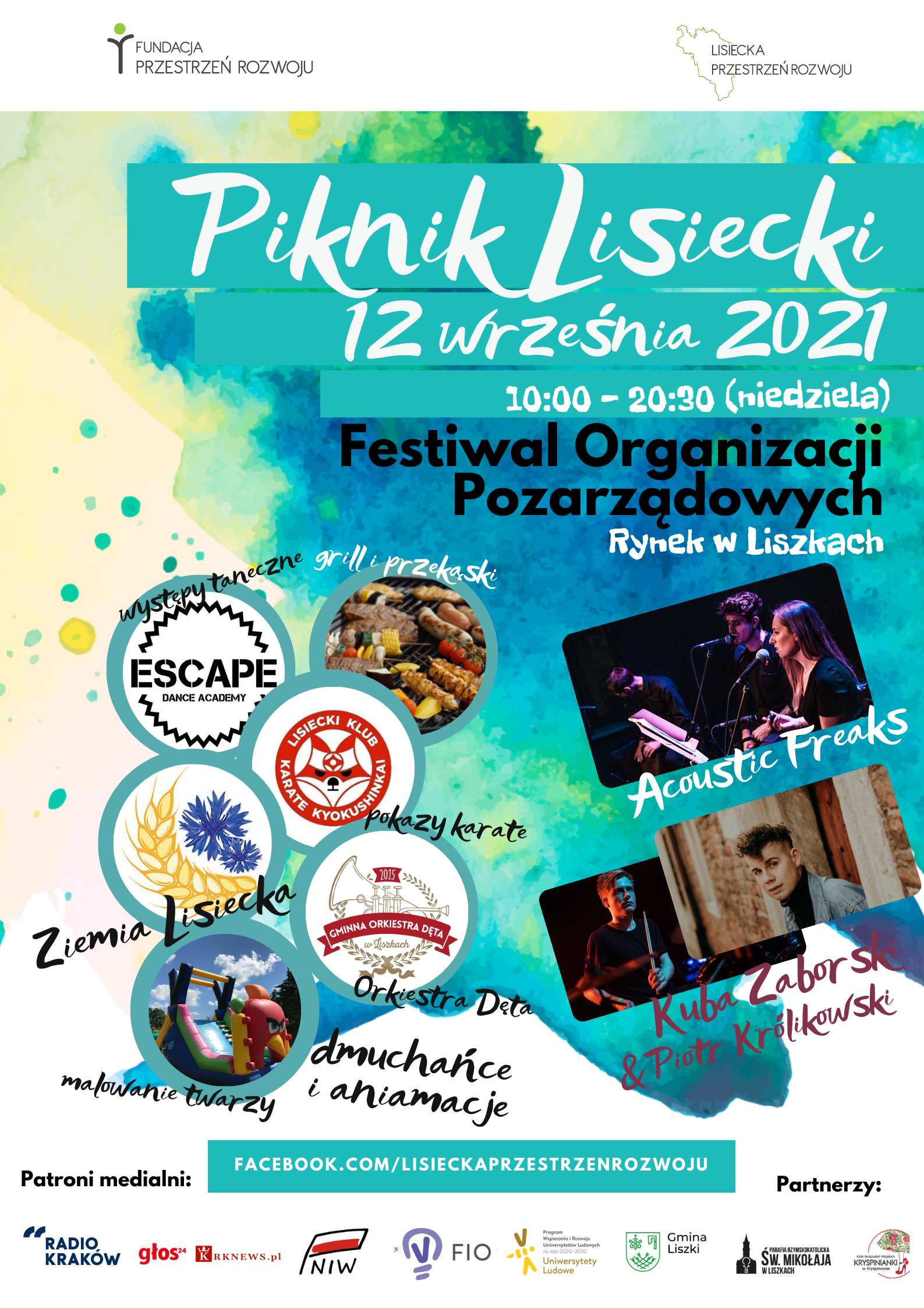 Fundacja Przestrzeń Rozwoju i Gmina Liszki zapraszają na Festiwal Organizacji Pozarządowych – Piknik Lisiecki, który odbędzie się 12 września 2021 r. na Rynku w Liszkach pod Krakowem.