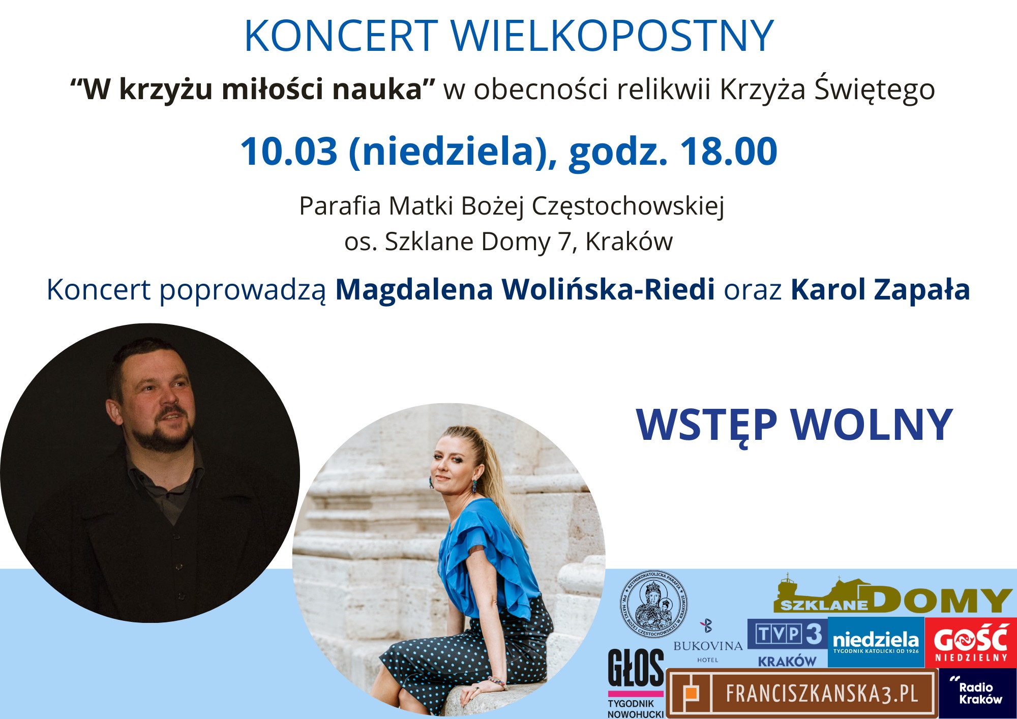 10 marca w niedzielę o godz. 18.00 w parafii odbędzie się Koncert Wielkopostny, który będzie miał wyjątkowo uroczysty charakter, bo będzie łączyć artystów z dwóch dekanatów: Kraków-Mogiła i Kraków-Bieńczyce. Wśród wykonawców będzie 8 chórów. Koncert poprowadzi znana dziennikarka Magdalena Wolińska-Riedi z Karolem Zapałą. To szansa na integrację nowohuckiego środowiska muzyki kościelnej.
