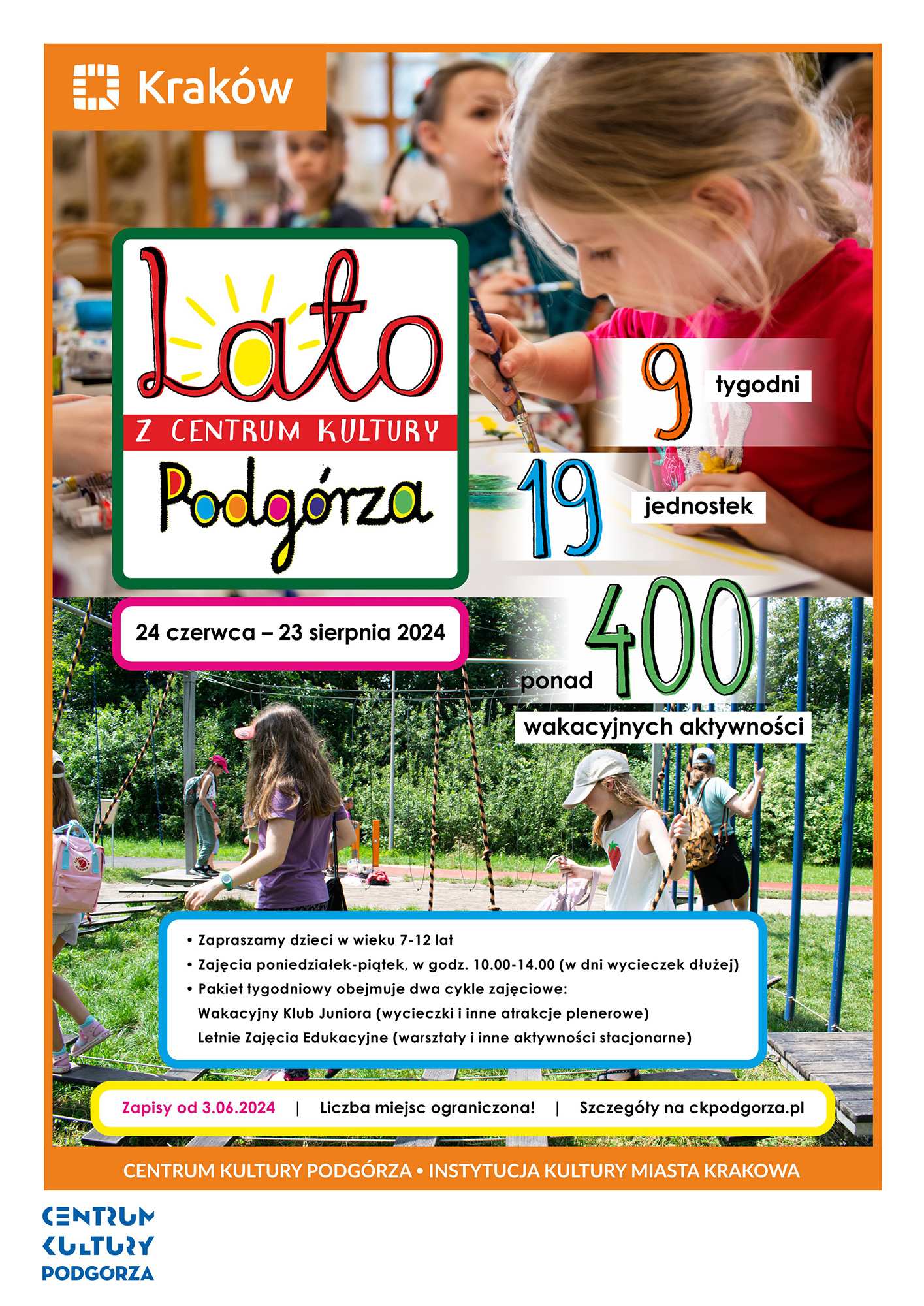Zapisy na wakacyjne aktywności z oferty CKP ruszają od 3 czerwca 2024. Zgłoszenia są przyjmowane osobiście (w biurze/punkcie informacyjnym danej jednostki), a także online i telefonicznie (dane kontaktowe do każdej z filii można znaleźć TUTAJ: https://www.ckpodgorza.pl/kontakt-filie). W dwóch ostatnich przypadkach, przed rozpoczęciem zajęć rodzic/opiekun zapisanego dziecka musi dostarczyć do organizującej letnie aktywności jednostki oryginał wypełnionej Karty Uczestnictwa.