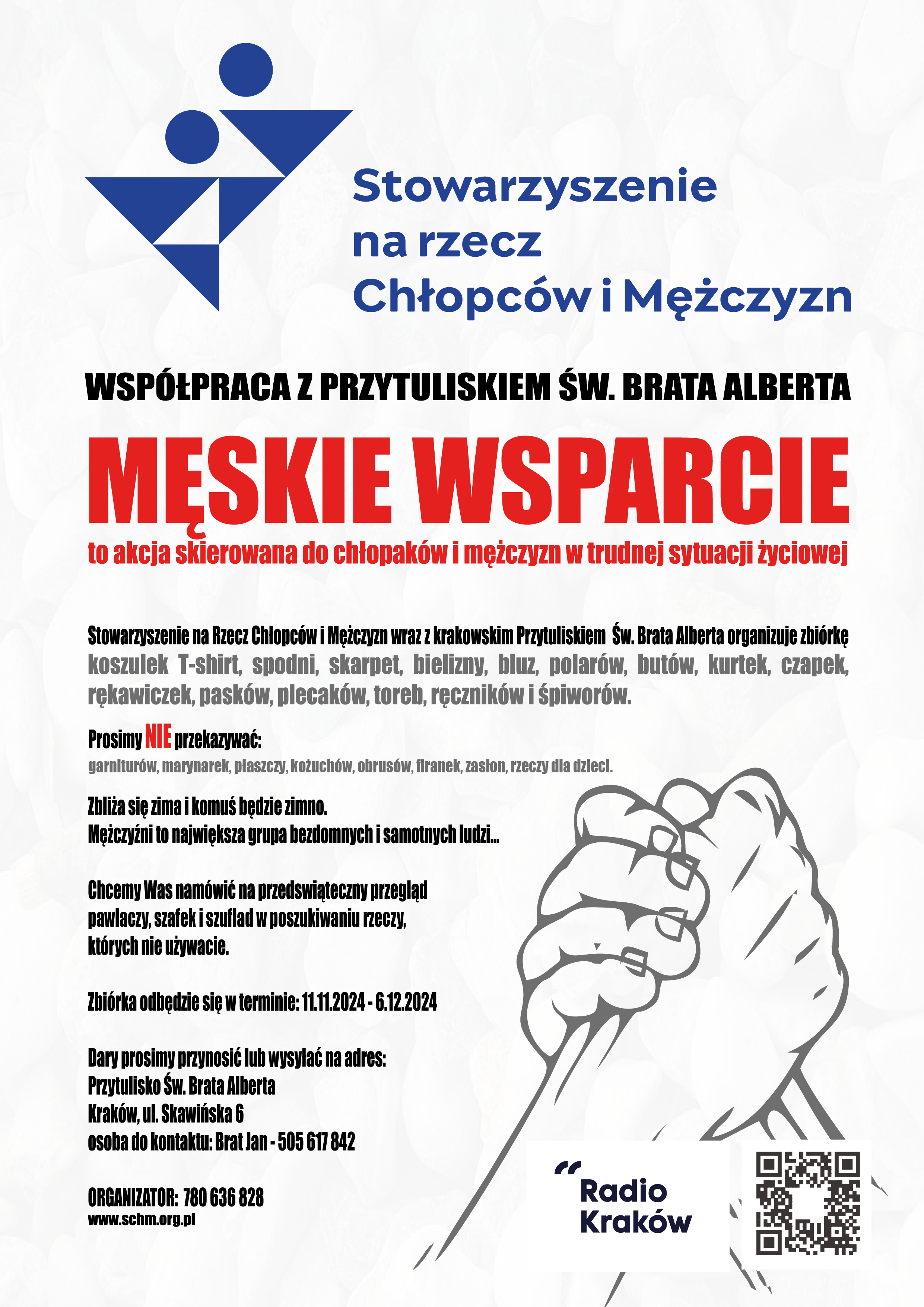 MĘSKIE WSPARCIE to akcja skierowana do chłopaków i mężczyzn w trudnej sytuacji życiowej Stowarzyszenie na Rzecz Chłopców i Mężczyzn wraz z krakowskim Przytuliskiem Św. Brata Alberta organizuje zbiórkę koszulek T-shirt, spodni, skarpet, bielizny, bluz, polarów, butów, kurtek, czapek, rękawiczek, pasków, plecaków, toreb, ręczników i śpiworów. Prosimy NIE przekazywać: garniturów, marynarek, płaszczy, kożuchów, obrusów, firanek, zasłon, rzeczy dla dzieci Zbliża się zima i komuś będzie zimno. Mężczyźni to największa grupa bezdomnych i samotnych ludzi...