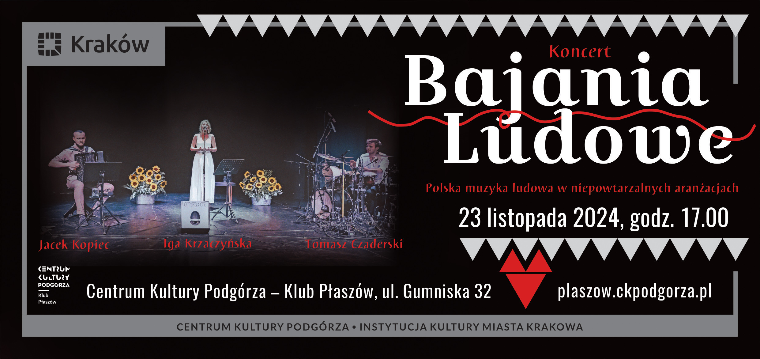 Bilety na koncert „Bajania ludowe” w Klubie Płaszów – w cenie 35 zł (normalny)/30 zł (dla posiadaczy karty Podgórze w Kulturze lub Karty Seniora CKP) można kupić online na plaszow.ckpodgorza.pl lub osobiście w biurze Klubu Płaszów (ul. Gumniska 32).