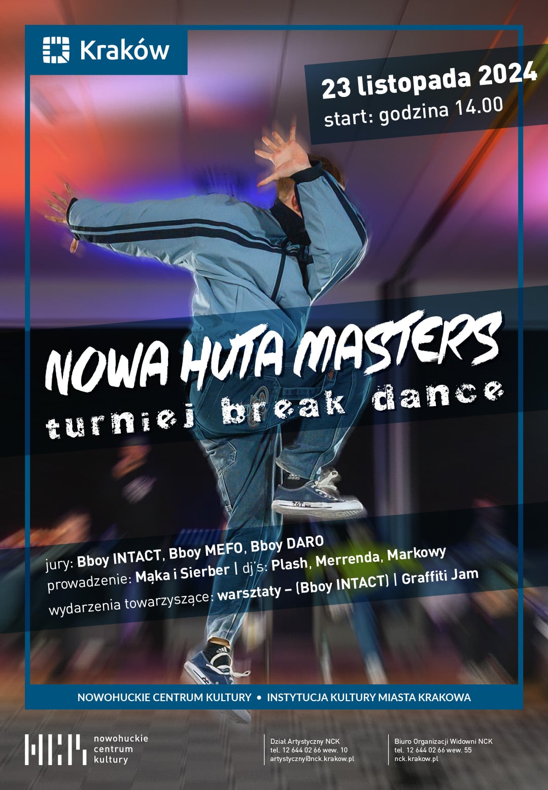 Konkurs bboys i bgirls bitw 1 vs 1, w których tancerze break dance zmierzą się ze sobą w dwóch kategoriach: KIDS (do 15 lat) i DOROŚLI (powyżej 15 lat). W jury NH Masters jak zwykle zasiądą trzy osoby, zasłużone na polskiej i międzynarodowej scenie, w tym roku są to: Bboy Intact, Bboy Mefo – Mateusz Godlewski, Bboy Daro – Dariusz Kryla.