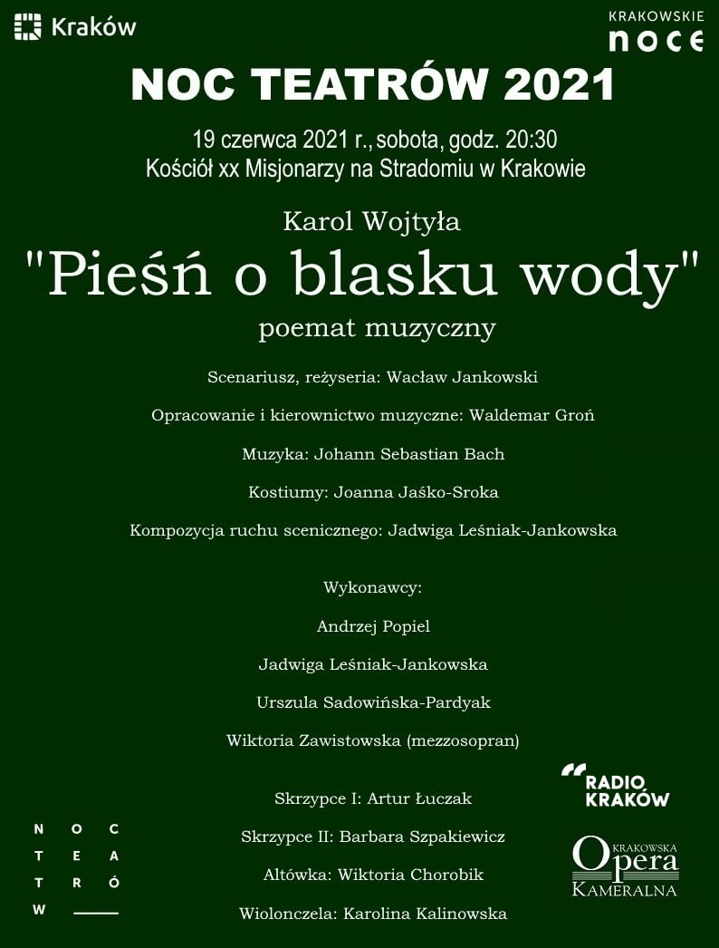 Bezpłatne wejściówki na poemat muzyczny „Pieśń o blasku wody” będą do odbioru 15 i 16 czerwca 2021 w godzinach 10:00-14:00 w siedzibie Krakowskiej Opery Kameralnej.