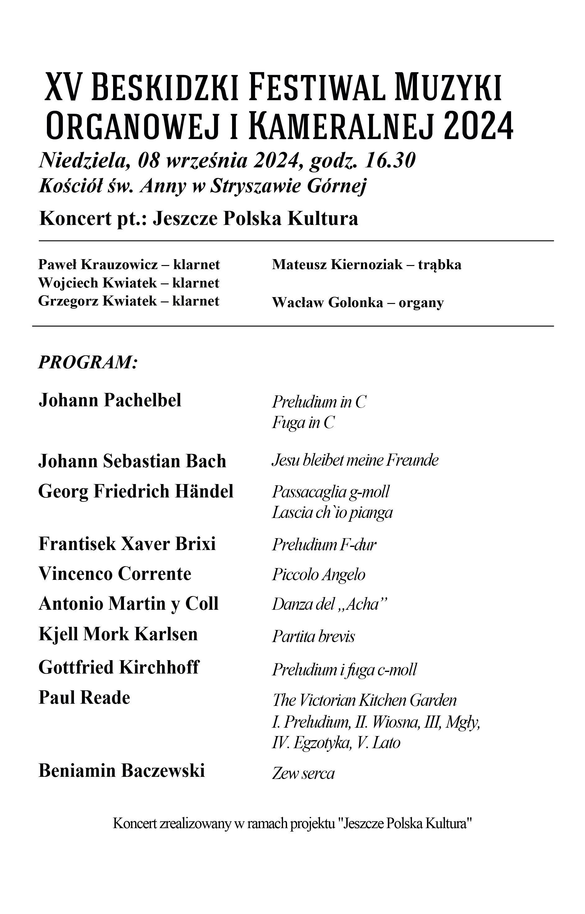 Koncert odbędzie się 8 września o godz. 16.30 w kościele p.w. Św. Anny w Stryszawie. Artyści zaprezentują muzyczne dzieła kilku znanych kompozytorów, m.in: Johanna Pachelbela, Johanna Sebastiana Bacha, Georga Friedricha Handla.