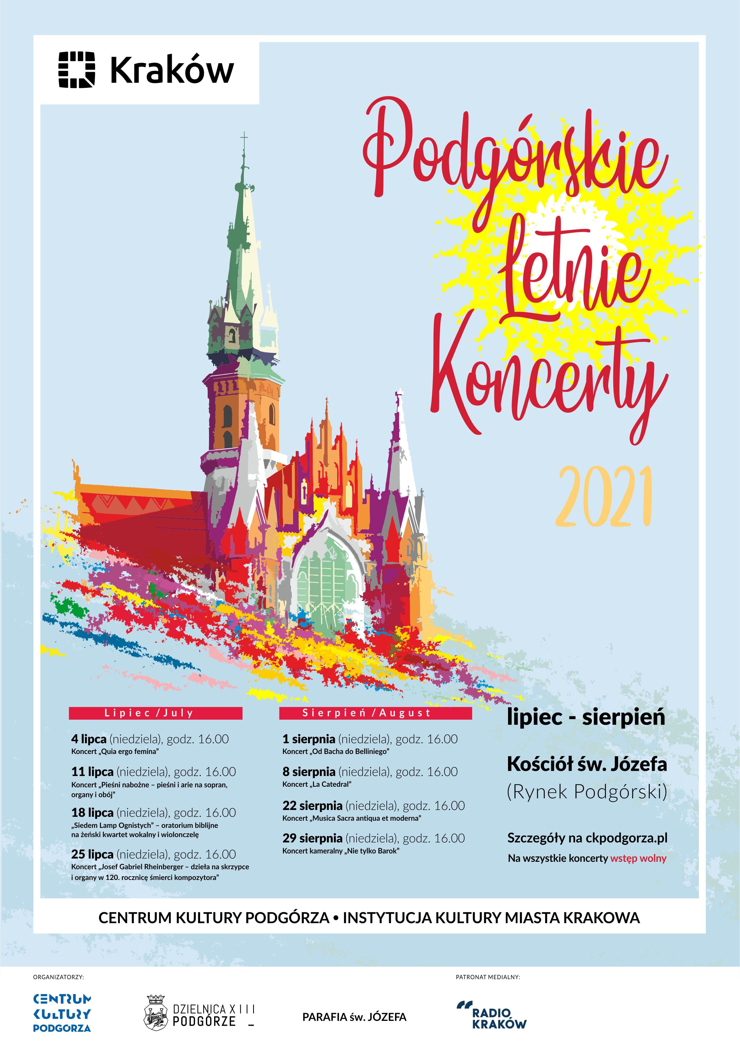 Wstęp na wszystkie Podgórskie Letnie Koncerty jest wolny. Organizatorami wydarzenia są: Centrum Kultury Podgórza, Rada Dzielnicy XIII Podgórze oraz Parafia św. Józefa w Krakowie.
