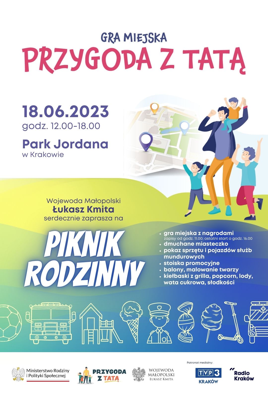 Gra miejska rozpocznie się w samo południe, kiedy to wojewoda Łukasz Kmita powita uczestników oraz kibicujące im rodziny. Od godz. 11.00 do godz. 16.00 drużyny będą mogły zgłosić swój udział w rozgrywce. 16.00 będzie też godziną startu ostatniej grupy. Każda drużyna składająca się z taty oraz dziecka lub dzieci otrzyma pakiet startowy i mapę gry.