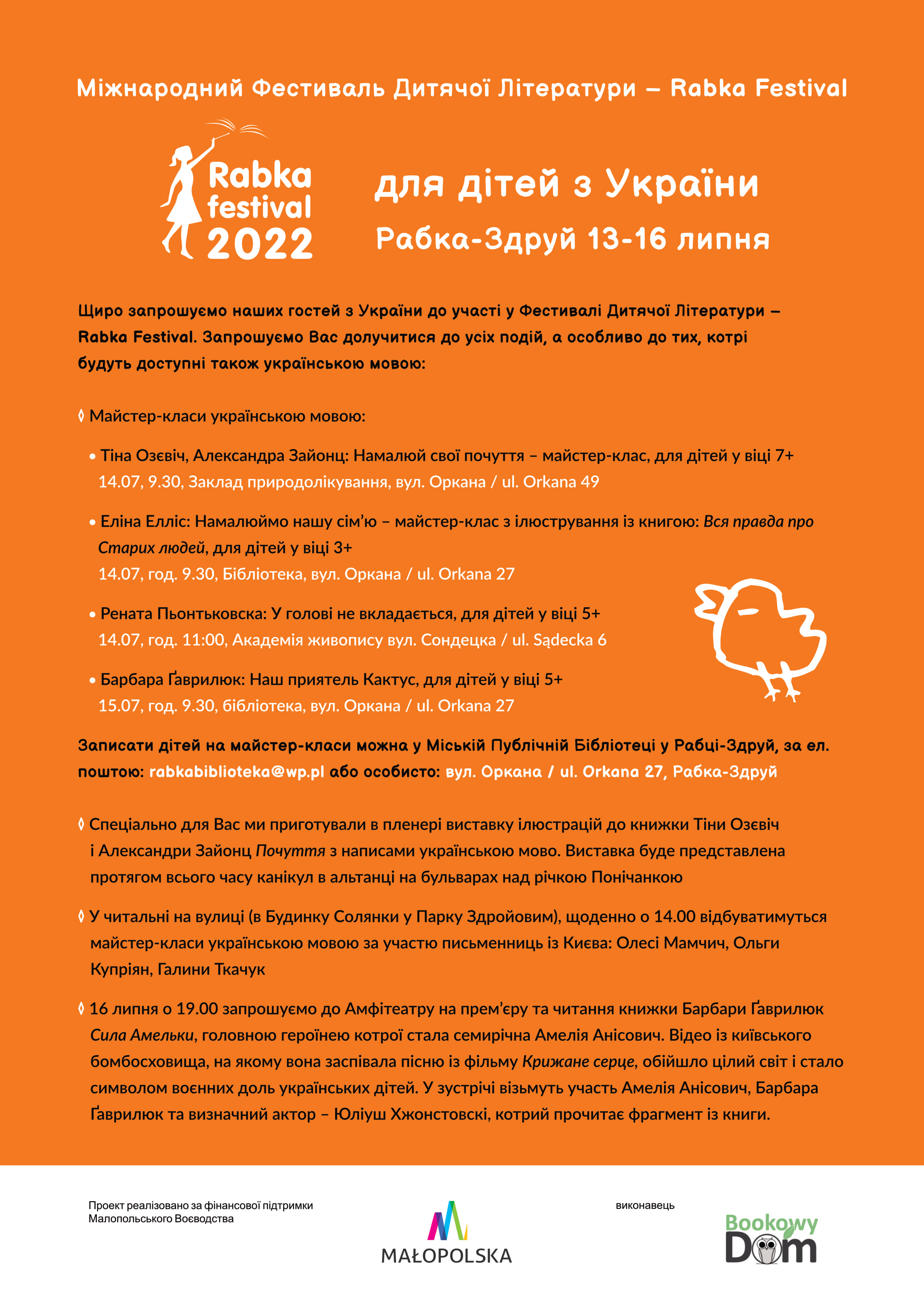 ü W „czytelni na polu” (w Domu Solanki w Parku Zdrojowym), codziennie o godzinie 13.00 odbywać się będą warsztaty w języku ukraińskim prowadzone przez autorki z Kijowa: Olesię Mamchych , Olgę Kuprijan i Halynę Tkaczuk