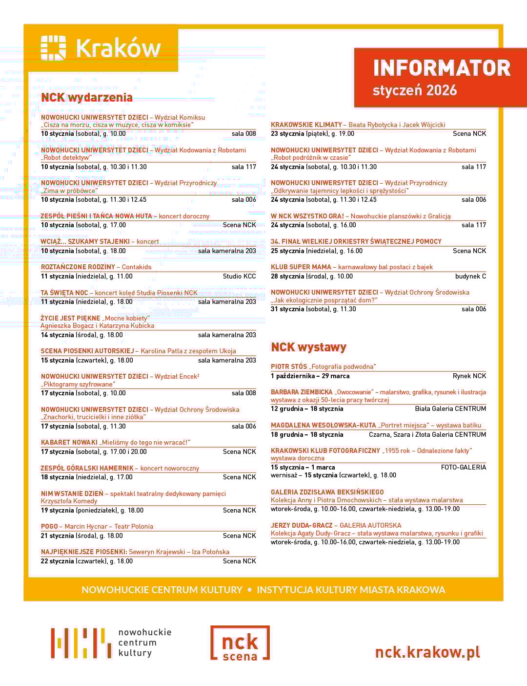 Czeka nas jeszcze cykliczne spotkanie dla miłośników gier planszowych - W NCK wszystko gra (24 I), karnawałowy bal przebierańców dla dzieci, w ramach Klubu Super Mama (28 I) i stały, styczniowy punkt programu, czyli koncert największej orkiestry świata, pod dyrekcją Jurka Owsiaka - 34. finał Wielkiej Orkiestry Świątecznej Pomocy (25 I).
