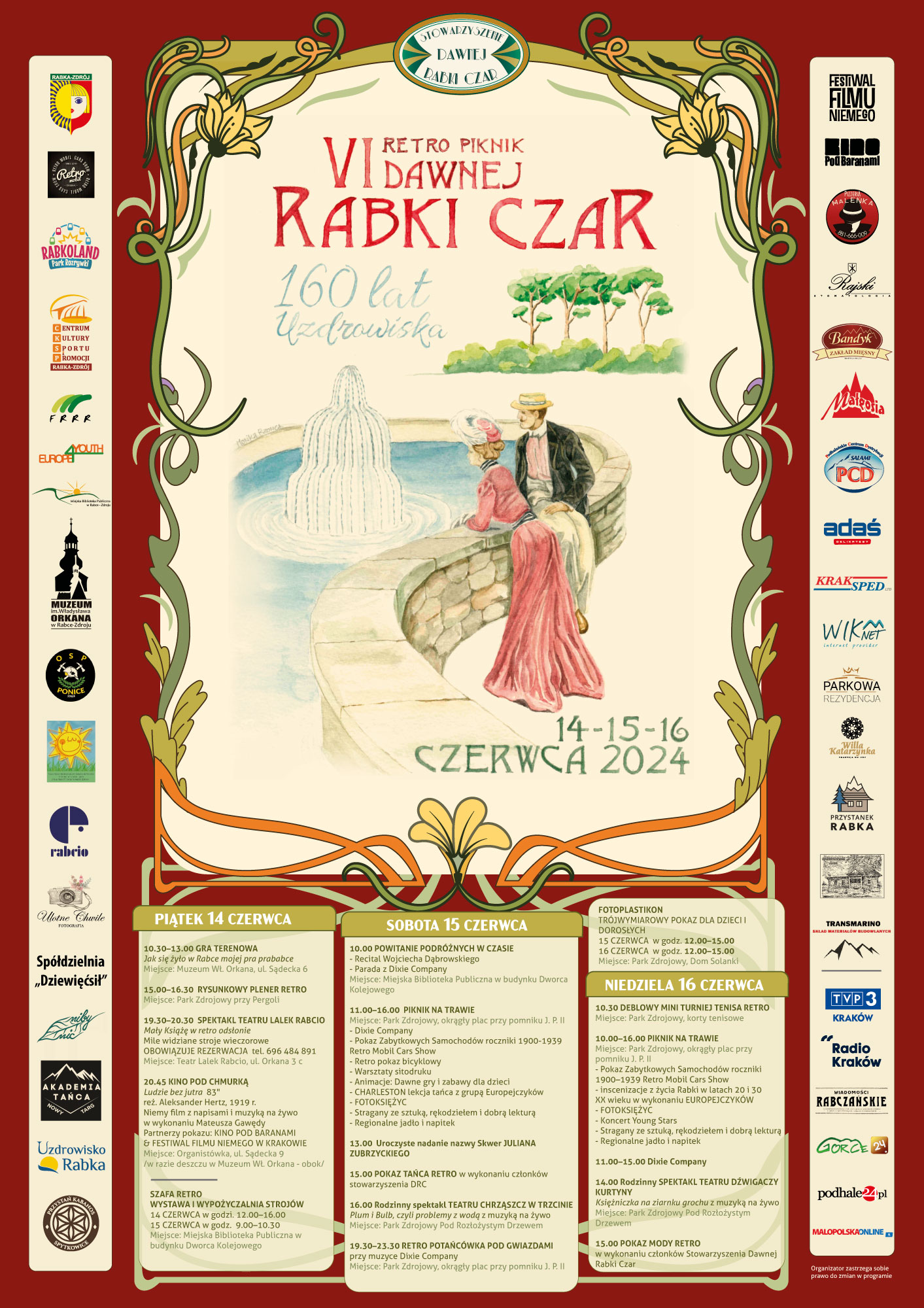 Na tle zabytkowej architektury Rabki, w rozkwitającym wiosną Parku Zdrojowym, można zanurzyć się w atmosferę przedwojennego kurortu! W czasie wydarzenia odbywać się będą: koncerty, pokazy taneczne, prezentacja automobili i bicykli, warsztaty, spektakle teatralne, pokaz filmu niemego, dawne gry i zabawy dla dzieci, rozgrywki sportowe oraz pikniki przybliżające przedwojenne tradycje kulturalno - społeczne, w których może wziąć udział każdy, bez względu na wiek czy ograniczenia. Uczestnicy Pikniku będą mieli okazję przenieść się w czasie dzięki stylizacjom retro i poczuć dawną kulturę, sztukę, muzykę, historię, modę, obyczaje społeczne, poprzez aktywny i bezpośredni udział w poszczególnych punktach programu.