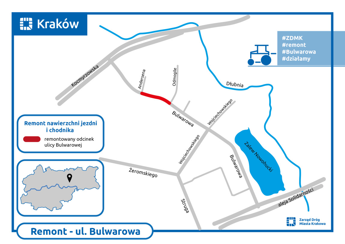 Remontowany jest ok. 220-metrowy odcinek od ul. Andersena do ul. Odmogile. Wymieniona zostanie nawierzchnia jezdni, odnowione zostaną chodniki. W trakcie prac pojawią się zmiany w organizacji ruchu.