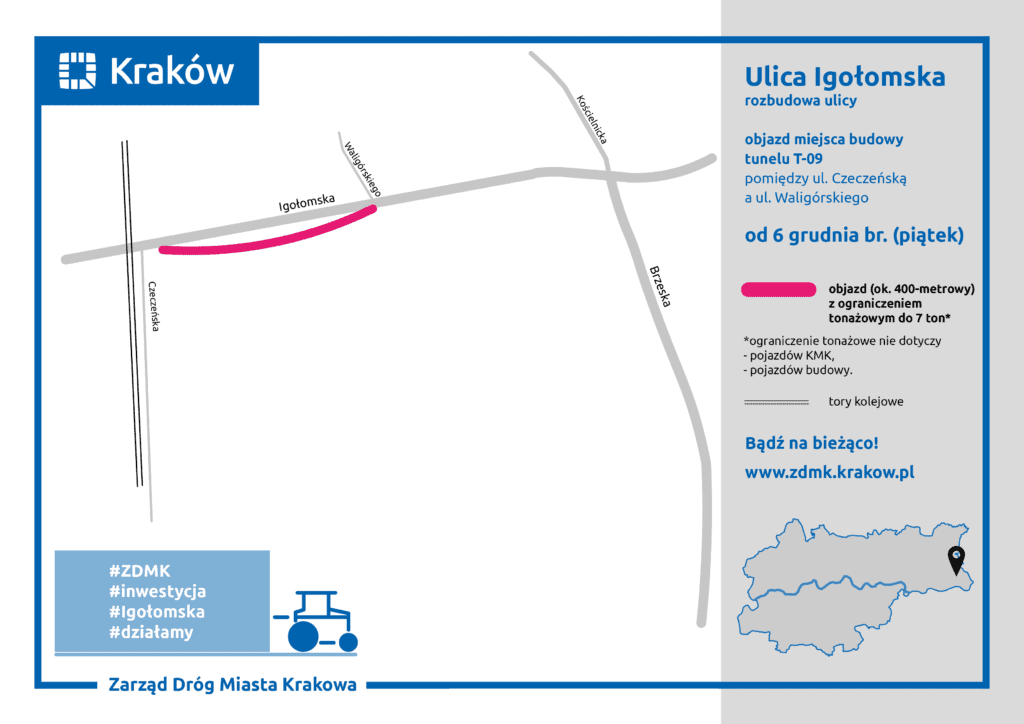 Na drodze serwisowej obowiązywać będzie ograniczenie tonażowe, zastępczą drogą będą mogły poruszać się pojazdy do 7 ton. Ograniczenie nie obejmie pojazdów komunikacji miejskiej, budowy oraz firm prowadzących działalność gospodarczą na tym odcinku ulicy Igołomskiej.